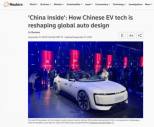 在最近的慕尼黑车展上,中国智电技术再次成为世界汽车舞台的焦点。但就在行业惊叹于中国智造速度与实力的同时,路透社的一篇报道却抛出一个耐人寻味的论调,称中国电动车技术在重塑全球汽车设计,“china inside”时代或许已经到来。