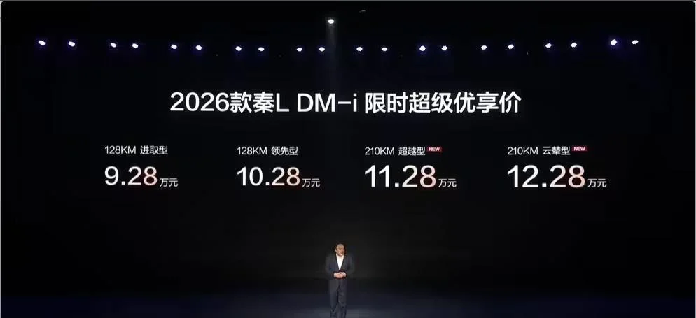 1月8日,2026款比亚迪秦l dm-i正式发布上市,提供限时超级优享价,区间为9.28万元至12.28万元。新车车身尺寸为4830×1900×1495mm,轴距2790mm,新增松烟绿、墨竹青与星河米三款车身颜色。