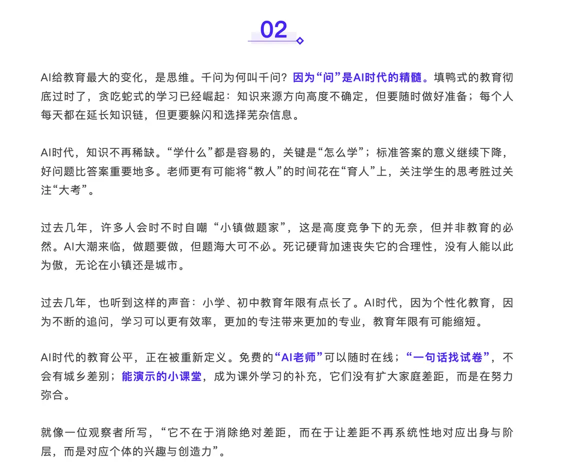 文章认为,ai对教育的核心影响可能在于学习方式的转变:从知识灌输转向以提问和探索为核心的“贪吃蛇式”学习。知识本身不再稀缺,提出好问题与培养判断力变得更为关键。ai时代,因为个性化教育,因为不断的追问,学习可以更有效率,更加的专注带来更加的专业,教育年限有可能缩短。