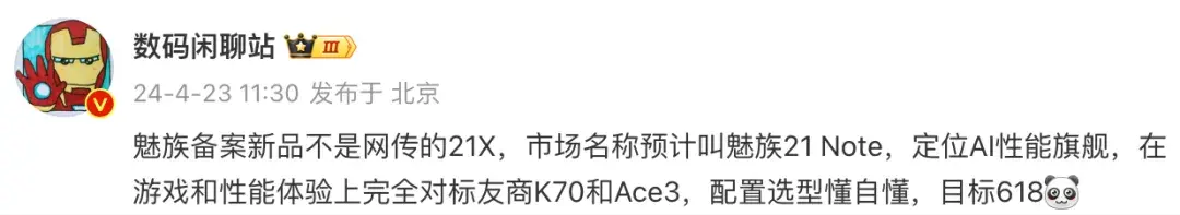 爆料还表示,魅族 21 note 主打性能,游戏和性能体验上对标 redmi k70 和一加 ace3。