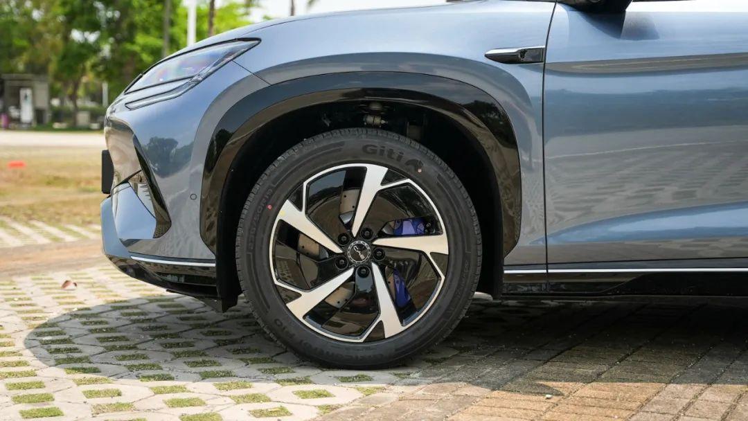 20英寸用熏黑处理的五辐条双叉轮毂运动感非常强。在轮毂里面,你还能看到有打孔的刹车盘和后置的卡钳。海狮07ev同样采用了前窄后宽的轮胎。
