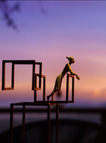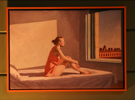 还有一个关于等待的小雕塑,是放在红色的餐桌上,对着室外,明显表达了一种思念。另外,我们这次还选用了三幅爱德华·霍普的画作,其中一幅是《清晨的阳光》,它们的主题都是关于等待,画中或单人或双人,也体现了男女之间的关系。