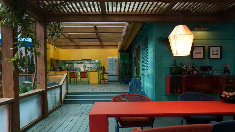厨房的主色调是黄色的,秦奋平时吃饭大都叫外卖,所以厨房并没有太多的使用感,没有很明显的烟火气。厨房连接的户外环境的地方,用了中黄色。但我们选用一张红色的餐桌,红色是热烈的,秦奋本身也是热烈的,他喜欢招待朋友,喜欢跟人聊天,喜欢喝酒,他的内心还是炽热的、澎湃的。我们希望这个餐桌大面积的红色可以跳脱出来,给人一种偾张感