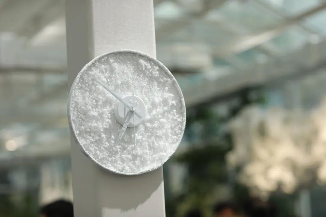 《剪云雕雪》一旁的柱子上有一块冰雪钟表,这款装置名为《雪凝时刻》,意为生命中某些时刻会“凝固”,成为永远的纪念。