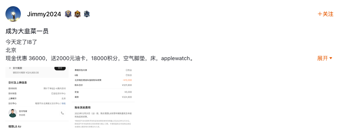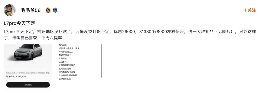 总的来说,目前2023款理想l系在春节前推出优惠活动,一方面是清库存行为,2024款l系将会在3月发布并交付,此举能够避免消费者存在信息差,购买2023款车型后存在不满行为。另一方面则是市场销售压力,理想汽车在2024年第一周销量被aito问界反超,l系车型销量下滑明显,降价优惠则能够让市场重新关注理想汽车。遗憾的是,理想汽车并未公布具体优惠金额,不同版本车型有不同的优惠幅度,各城市地区之间的优惠幅度也大有不同。