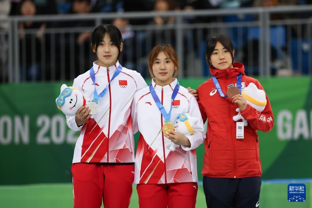 1月20日,冠军中国选手杨婧茹(中)、亚军中国选手李金恣(左)与季军日本选手井上暖乃美在颁奖仪式上合影。新华社记者 许雅楠 摄