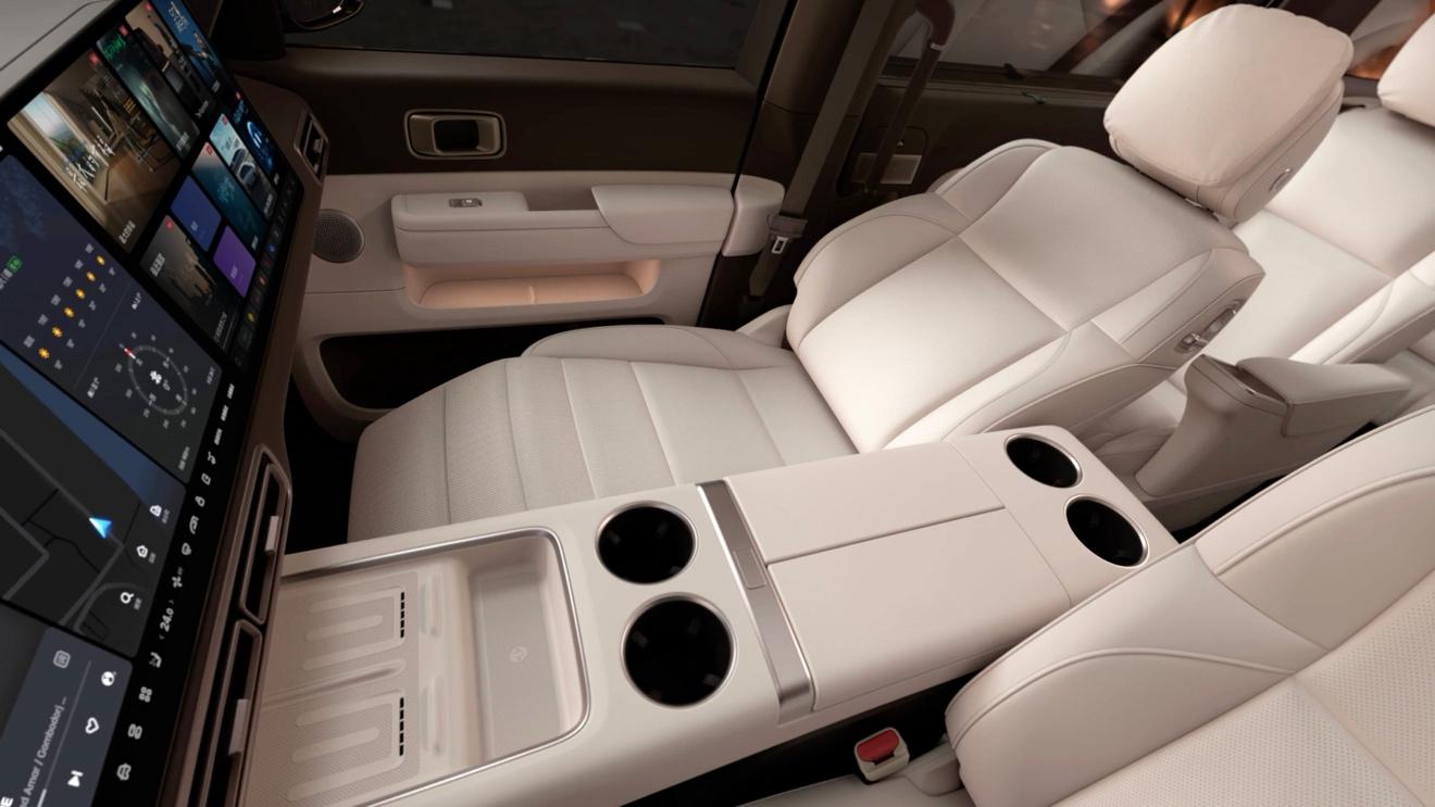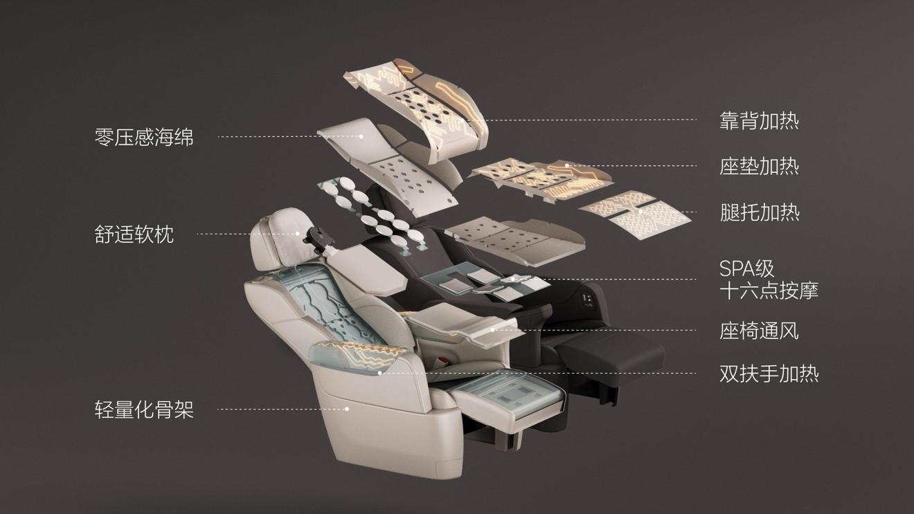 此次公布的内饰图片中,新车第二排配置独立座椅,具备一体化腿托加热、95度靠背后躺角度调节以及500mm前后电动调节等功能,同时配备50w无线充电面板。官方数据显示,理想mega第二排座椅坐垫宽度为532mm,扶手宽度达到115mm,均采用打孔nappa真皮材质打造,并提供十六点按摩功能,其中座垫六点、靠背十点,且引入了新270°环抱式座椅加热系统。配置方面,理想mega第拥有17英寸第四代三星oled后排大屏、2200瓦车内外放电接口、小桌板及车载冰箱等。