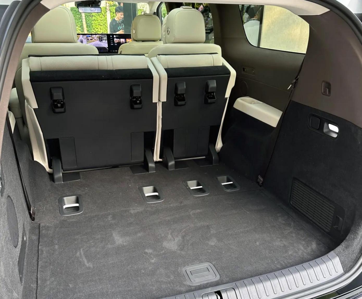 第三排座椅直立状态下,后备厢能容纳4个28英寸和2个20英寸行李箱,可以满足6-7人出行的装载需求。官方数据显示,mega后备厢标准纵向长度为680毫米,当第三排座椅折叠时可延伸至1066毫米。第三排座椅支持电动向前翻折,二、三排座椅全部折叠后形成"大床"模式。
