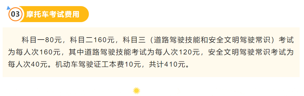 在收费这方面各地标准并未统一,一般来说科目一到科目四,加上驾驶证工本费的话,普遍300-500元就可以搞定了(具体以当地收费为准)。此前济南就公布了摩托车考试具体费用,科目一到科目四,加上驾驶证工本费,一共在410元。
