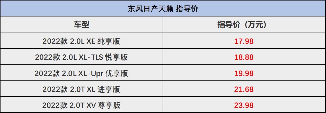 天籁在国内的熟知度不用多说,自打2004年正式进入国内销售至今,已经接近20年时间,几代天籁在国内都有着十分不错的销量和口碑,提起它就会和舒适、“大沙发”、省油这些词联系在一起。现款在售的天籁共有5款车型,指导价区间为17.98万至23.98万。不过指导价不意味着实际成交价,天籁在不少地区已经有着超过4万的终端优惠幅度,以指导价17.98万的2022款 2.0l xe 纯享版为例,优惠之后的价格为13.98万,不到14万的价格可以买到一款合资中型车,从性价比的角度来看,已经挺划算了,要知道这个价格其实已经和很多紧凑级轿车相当了。