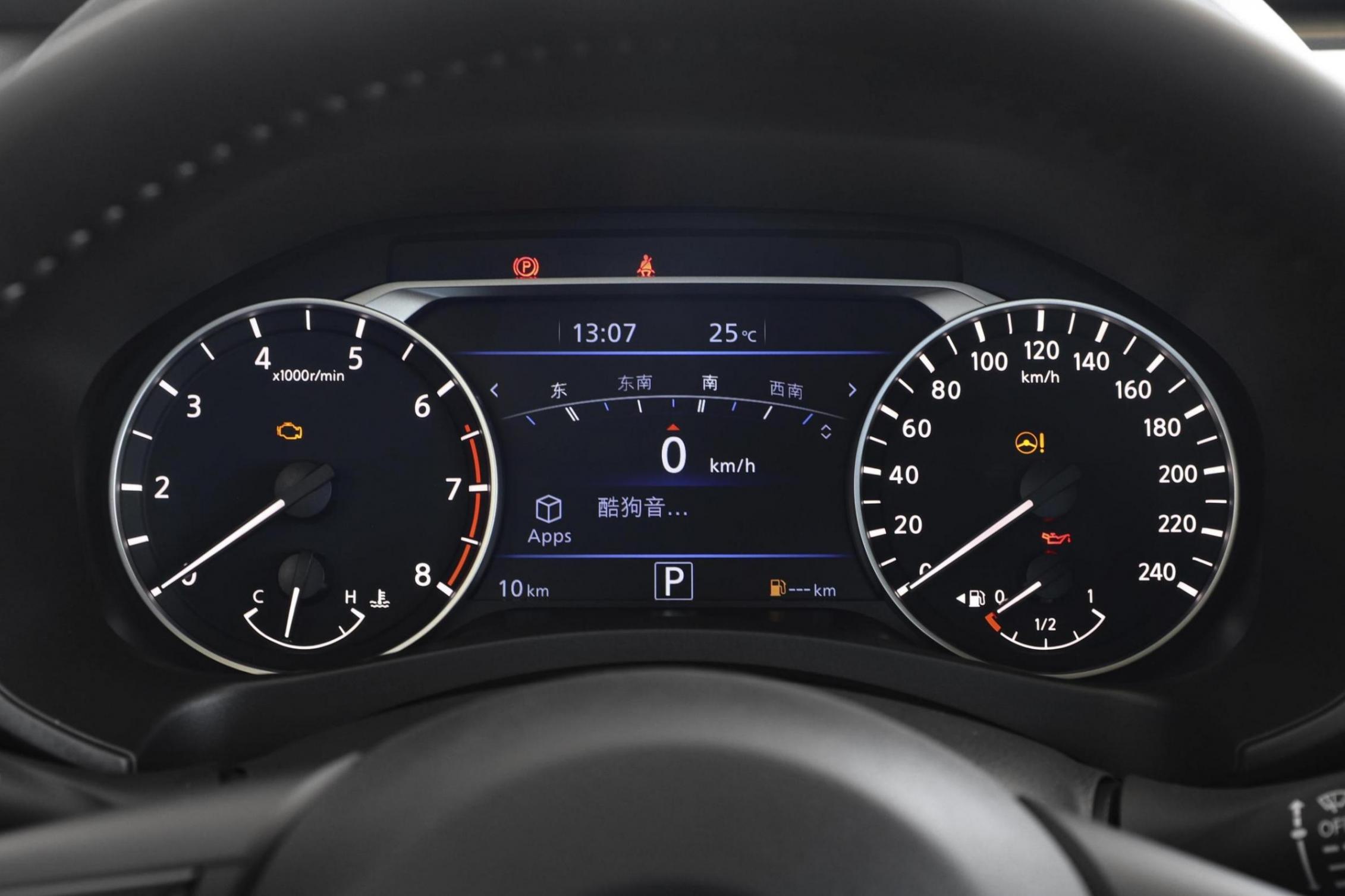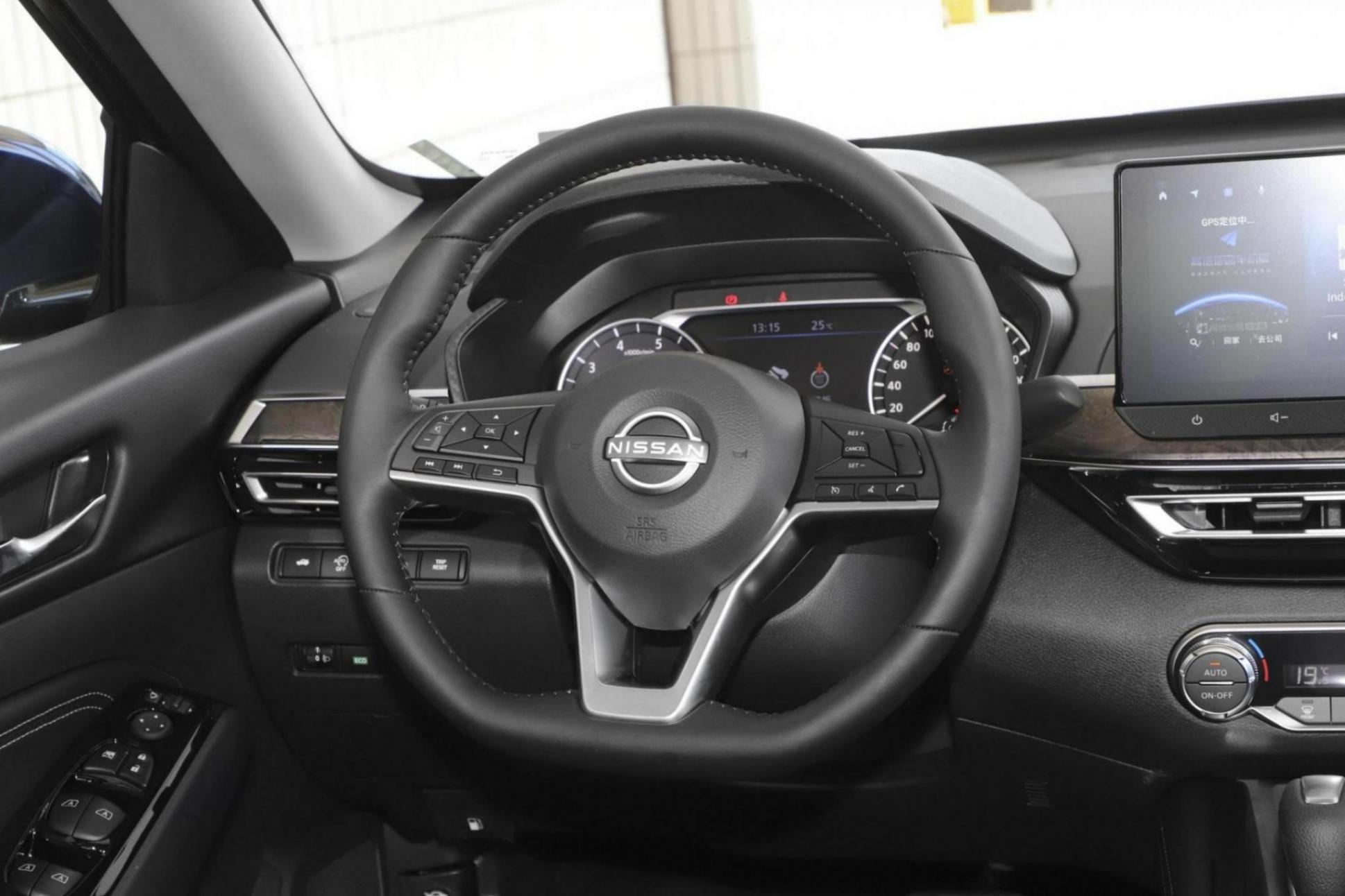 方向盘是日产家族化的风格,三幅平底式的布局,同时多功能按键的尺寸很大,不容易出现误触的现象。方向盘前方有一块7英寸的液晶仪表盘,当然两侧还是实体的指针仪表,很多人觉得少了科技感,但事实上,在实用性上,指针仪表盘有着先天的优势。
