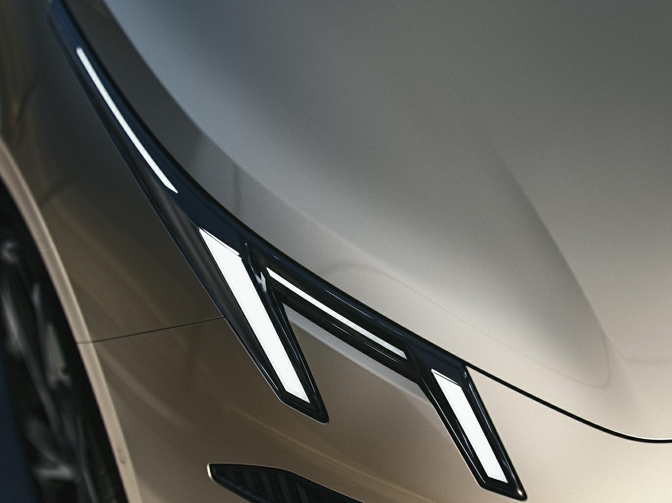 领克标志性的日行灯更加修长,主大灯组则与前保险杠的装饰条融为一体,且更加细长,下保险杠也加入了梯形的进气格栅造型。