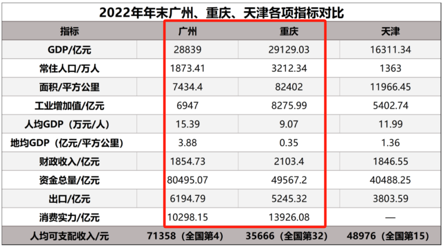 事实上,无论是占地面积、人口数量、甚至是工业增加值、财政收入,重庆都力压广州,似乎拥有更大的潜力,但重庆相当于一个省的体量与广州一市竞争。