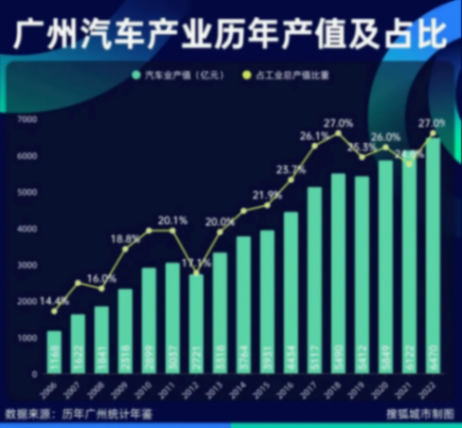 广州汽车产值也随着攀升,2006年,汽车产业总产值突破1000亿,到2022年突破6000亿元大关,直到今天,汽车都是广州经济第一支柱。