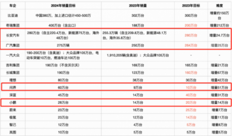 当然,问界2024年的目标也可能完不成,因为截至2月18日,问界只有4万辆销量,还不到一个月5万的计划;小鹏的情况更不乐观,2024年计划销量24万辆,但截至18日,小鹏仅完成1万辆左右,大概率也完不成年初目标,这种事情也不是没有先例,小鹏此前多年的目标基本没有完成过。