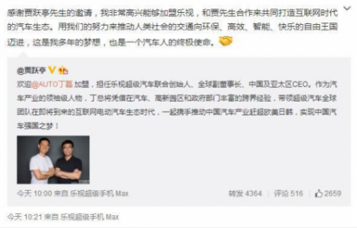 2015年,丁磊加盟乐视超级汽车,担任全球副董事长,中国及亚太区ceo。