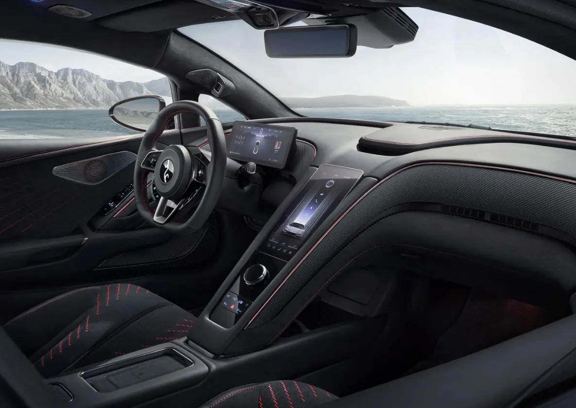 车内设计同样令人惊艳,环抱式座舱搭配碳纤维和麂皮材质,彰显奢华感与运动感。全液晶仪表和竖向中控屏幕展现出科技感,智能驾驶辅助系统更是为驾驶者提供了全方位的驾驶支持。