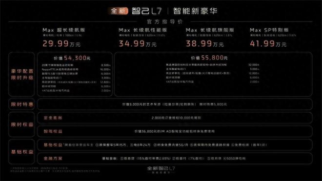 2月24日,“智能新豪华”全新智己l7,惊艳进化,焕新上市。全新智己l7共推出4个版本,售价区间:29.99万元—41.99万元。同时推出了限时上市权益,即日起至3月31日,下定全新l7,尊享至高价值63,800元限时购车好礼。
