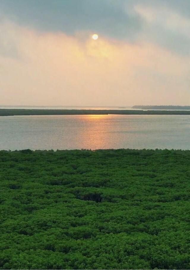 △海南东寨港,扎根在海水中的红树林,属海洋木本植物群落,是海洋生物洄游、繁殖、栖息的重要场所,具有造陆、护岸、净化海水的功能,被誉为“海岸卫士”。