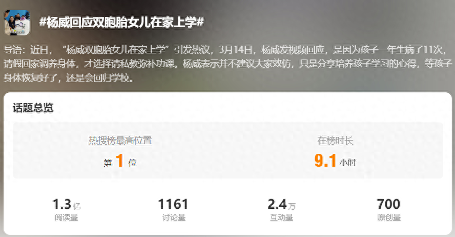 3月12日,原中国体操运动员、奥运冠军杨威发视频称,自己本该上小学一年级的双胞胎女儿目前都在家上私教,引发热议。14日,杨威发视频回应称,选择私教不是因为有钱,而是孩子频繁生病很无奈,相关话题再次登上微博热搜第一。