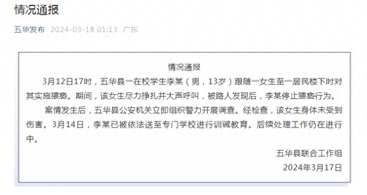 3月18日,记者从梅州五华县联合工作组获悉,3月12日17时,五华县一在校学生李某(男,13岁)跟随一女生至一居民楼下时对其实施猥亵。期间,该女生尽力挣扎并大声呼叫,被路人发现后,李某停止猥亵行为。
