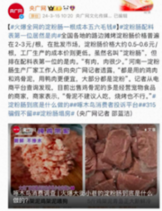 “315”当天,央广网曝光了淀粉肠用鸡骨泥代替鸡肉、以次充好、脂肪含量越来越高、无专门国标等乱象。报道称,河南一淀粉肠生产厂家表示,配料有肉但很少,都是用的鸡肉和鸡骨泥,用鸭肉更便宜,大部分都是淀粉。