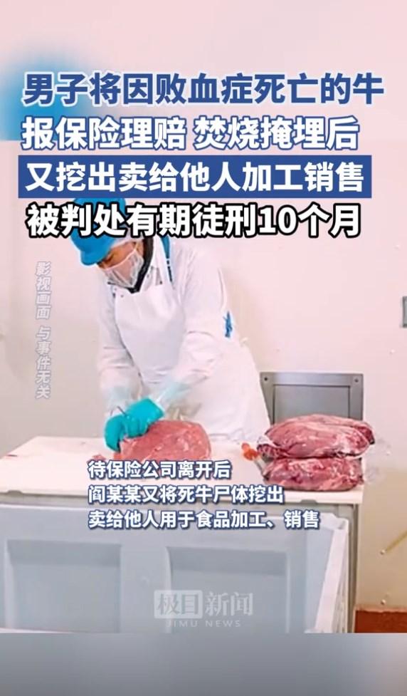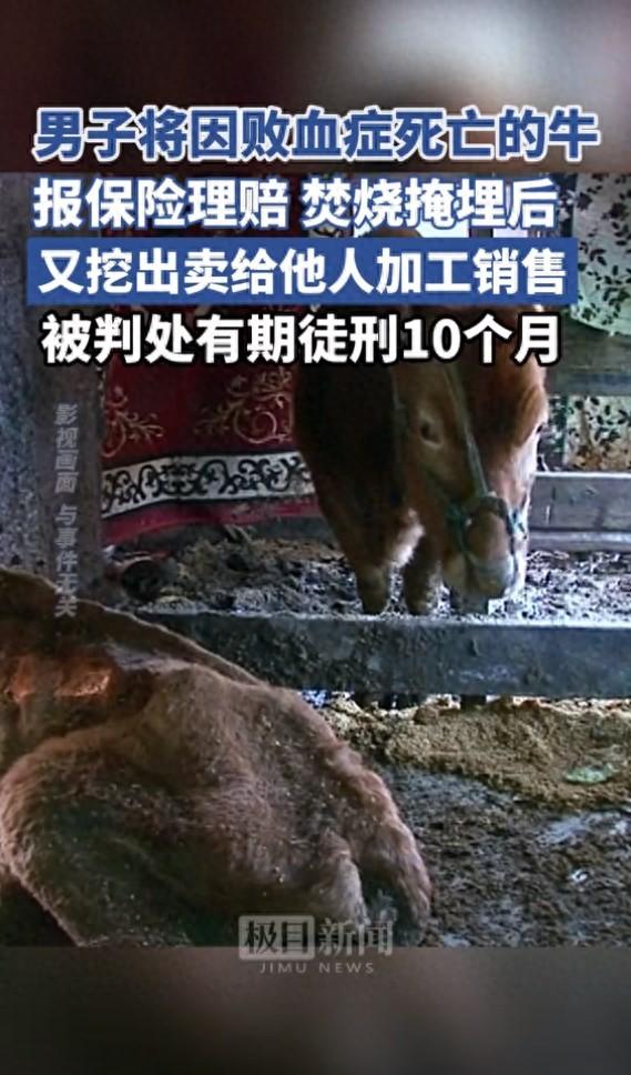 原来男子不仅想得到保险公司的理赔,还想将这个牛再低价卖给食品公司以此来牟利,挖出牛的尸体之后,男子迅速联系上了某家食品公司的经营者,两人一拍即合,对方低价将这个因为败血症死亡的牛拉走了,并且加工成了食品,卖给了消费者。案件曝光之后,法院判处男子有期徒刑10个月,并处罚金2万元。