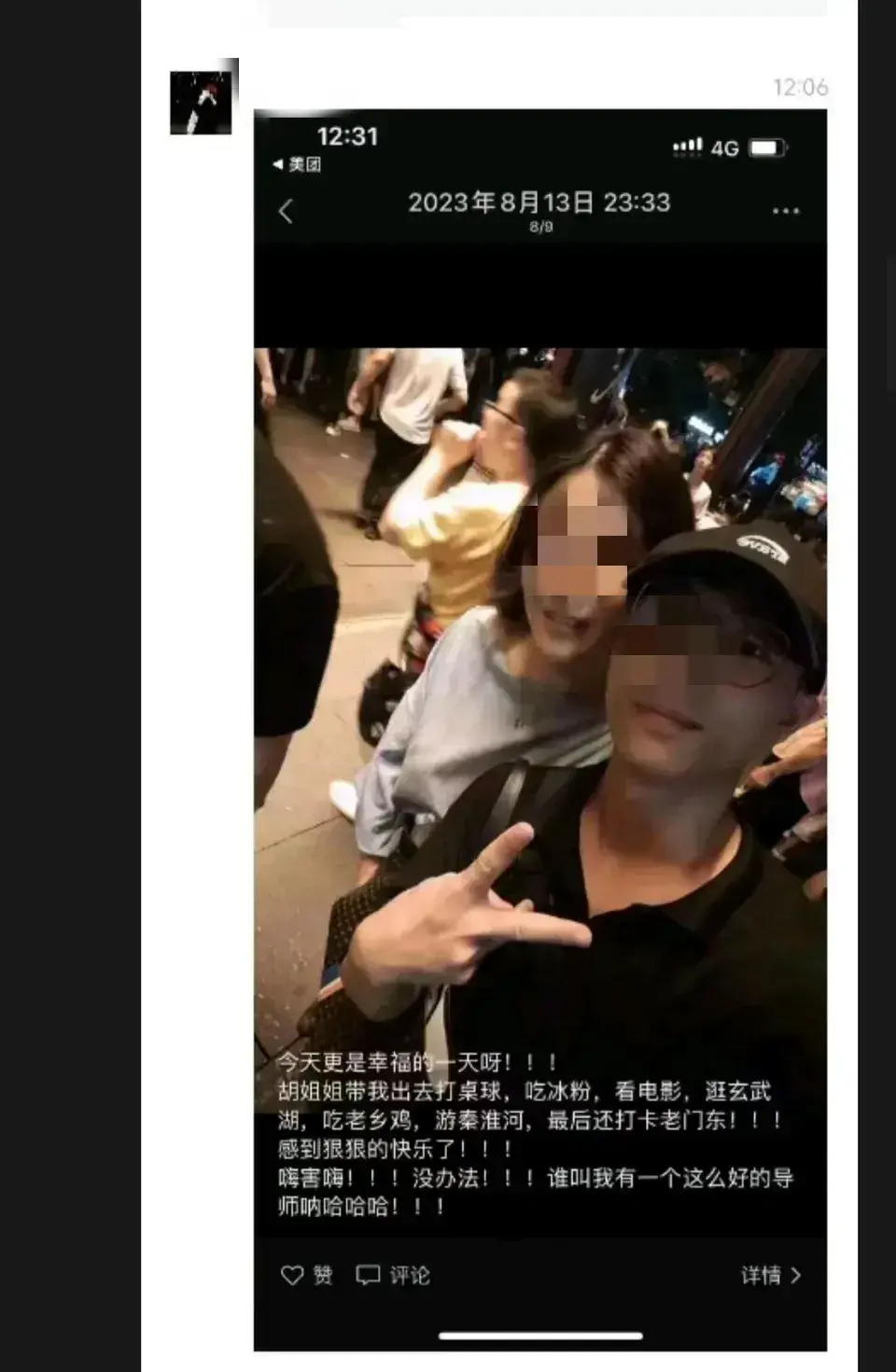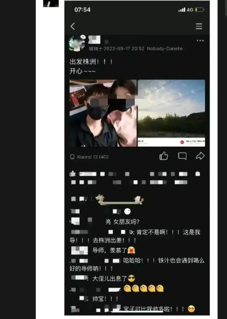 在这条动态的评论区,还有郑某的朋友问他合影的女子是不是他的女朋友,郑某说不是,他说这是他的导师,他们一起去株洲出差。